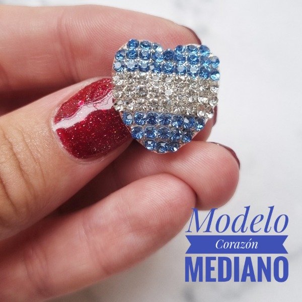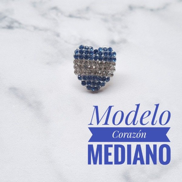 Pin en forma de corazon con strass celeste oscuro y blanco, base y snap plateado.